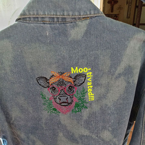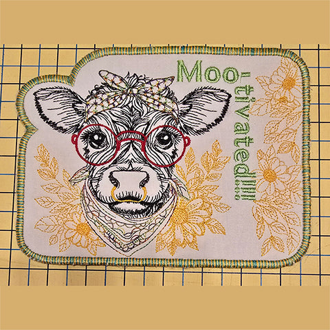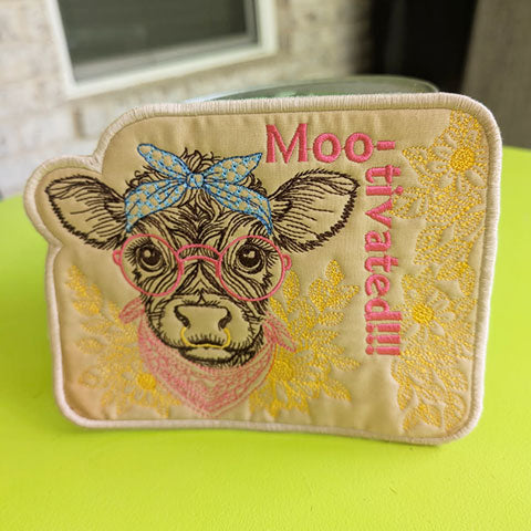 My dear friend Vicky got to work and created this lovable, beautiful Mug Rug from our "Moo tivated Cow with glasses Mug Rug Combo". She made it as a gift for her daughter-in-law.