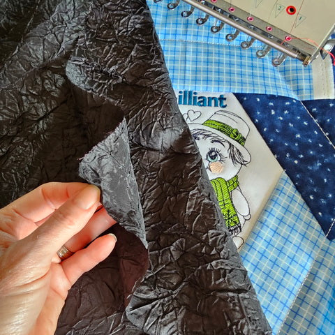 6. Add the backing: After all six coordinating fabric strips are attached, the machine will stitch a larger hexagon outline. Cover the entire design with your backing fabric (right side down) and complete the final stitch sequence.