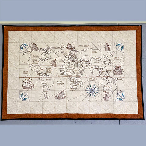 We're delighted that Terry shared photos of her finished Antique World Map Quilt with us! She's displayed it beautifully on her wall and decided to work with the same palette we used in our origin