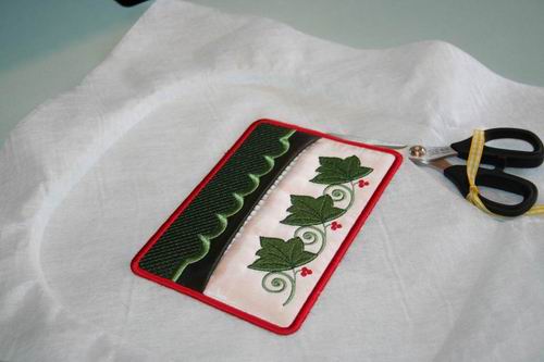 Step 23: Remove design from hoop. Cut away the excess fabric, leaving a seam of approx 2.5″ all around.