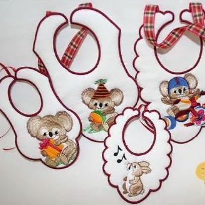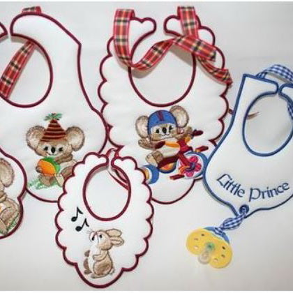 Baby bibs. These are real quick and fun to make. All in the Hoop You receive: x 5 Bibs Sizes when complete: 6*10 Hoop Bibs x 3 Sizes when complete: 8.9" H x 5.7" W (neck opening 3" x 2.5") 5*7 Hoop: Bibs x 3 Size when complete: 6.7" H x 4.8" W (neck opening 2.7" x 2.2") Size when complete: 5.9" H x 4.4" W (neck opening 2.2" x 1.8")