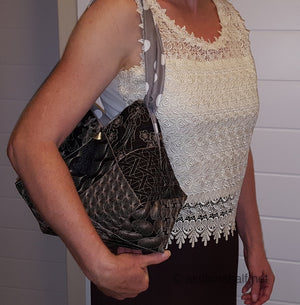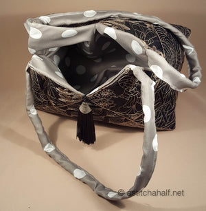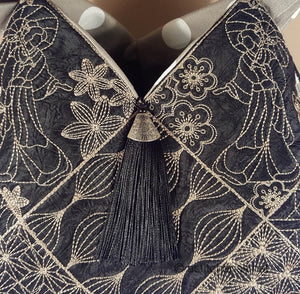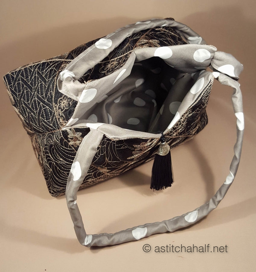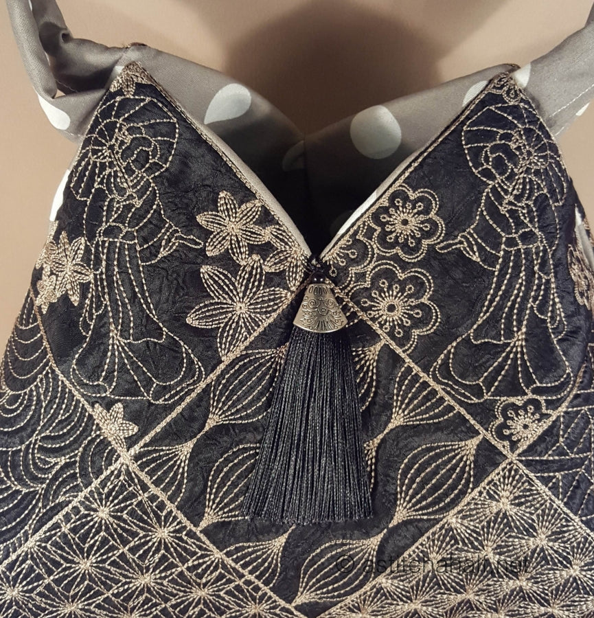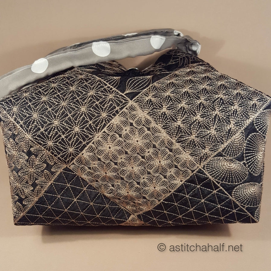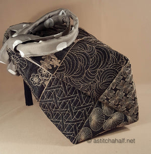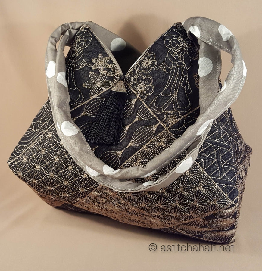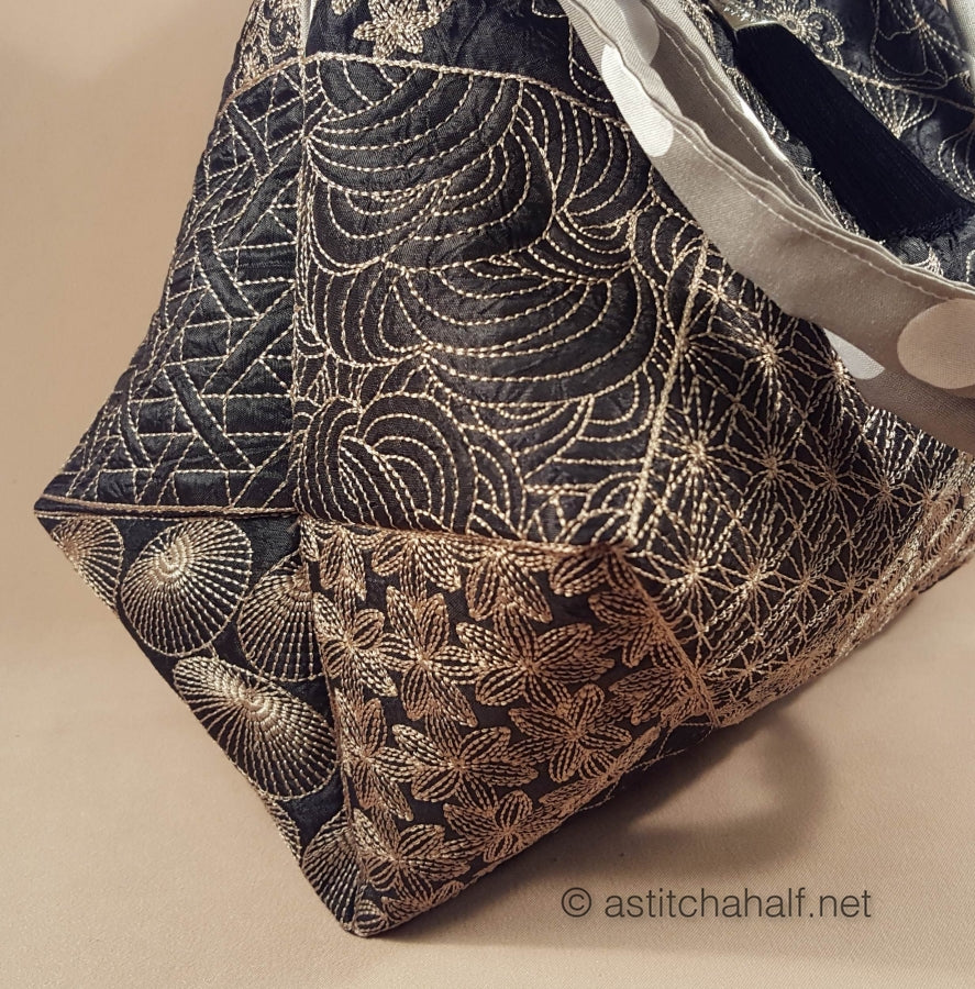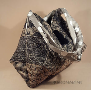 The Tote Bag size will be approx 12" x 13" (4*4 hoop bag) or 14" x 15" (5*5 hoop bag). Use the large Blocks to complete a Beautiful Quilt.