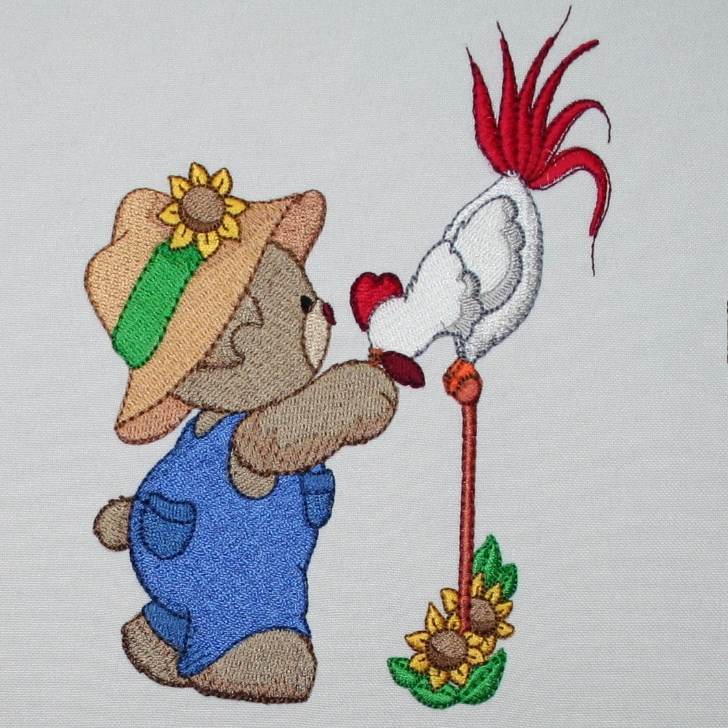 Daniel is feeding Ronald Rooster and teaching him some tricks too. This embroidery design will look great on toddler clothing. Collect all these designs to stitch a wall hanging or quilted blanket.