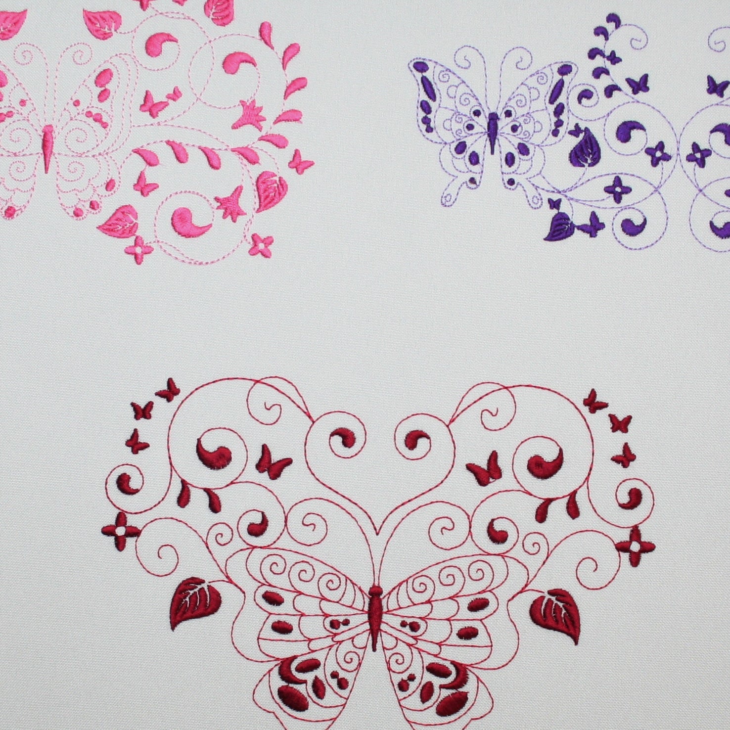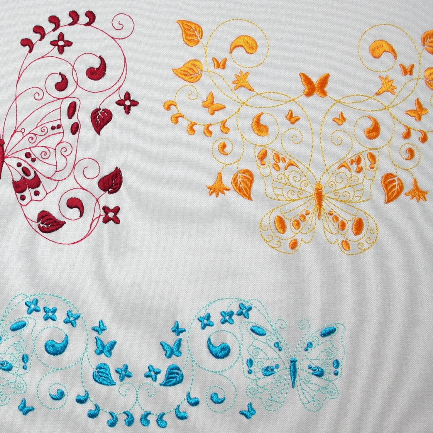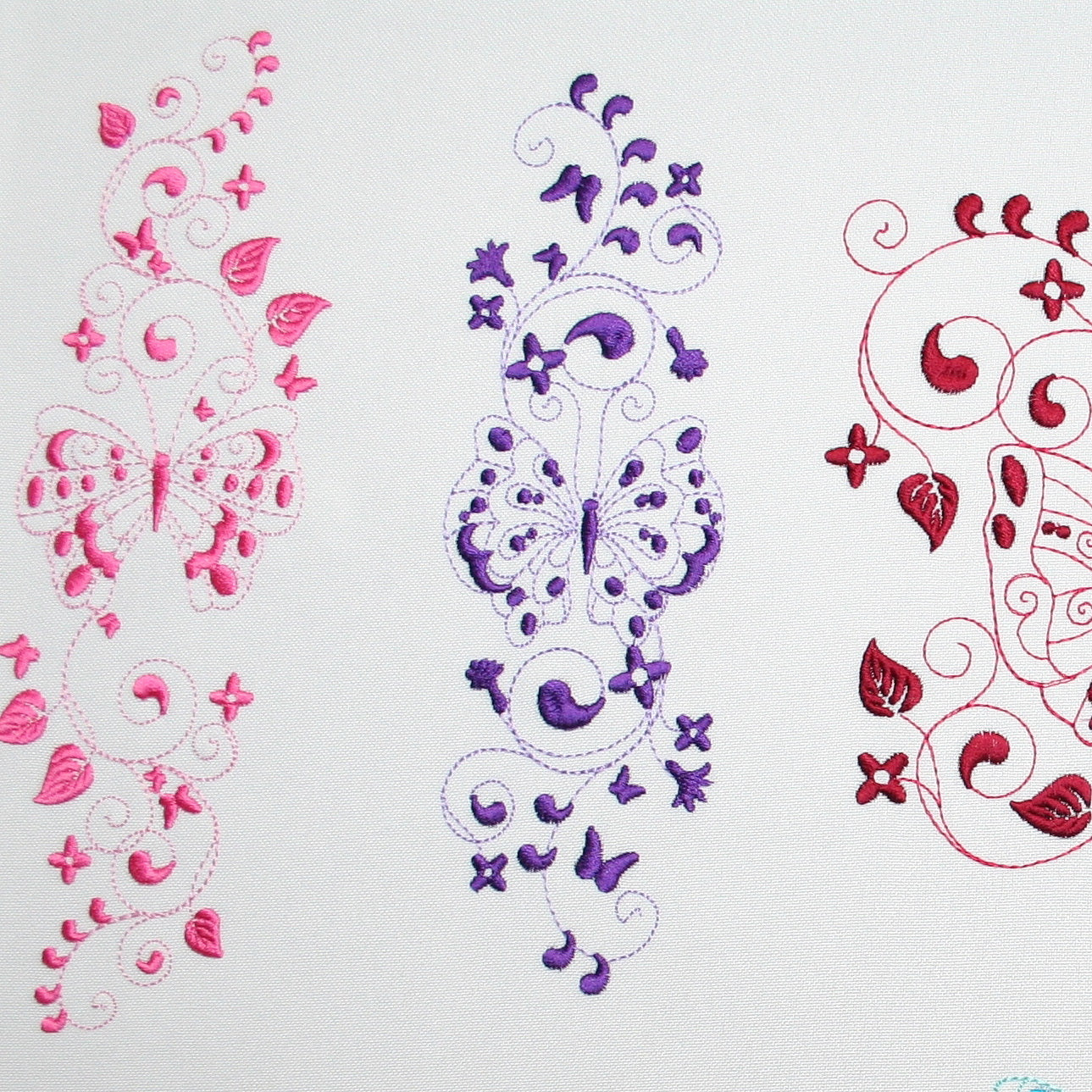 Embroider these 2-tone butterflies to create a quick and easy yet exquisite looking gift like edging along a table cloth, napkin, skirt border or blouse pocket. Use your favorite Spring, Summer, Fall or Winter colors to bring the garden into your home with these colorful happy butterflies.