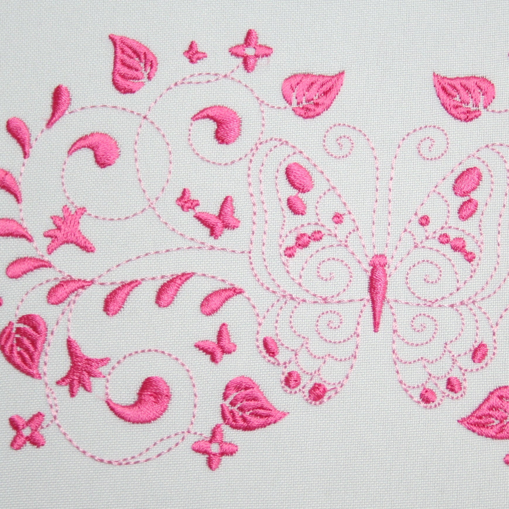 Embroider these 2-tone butterflies to create a quick and easy yet exquisite looking gift like edging along a table cloth, napkin, skirt border or blouse pocket.