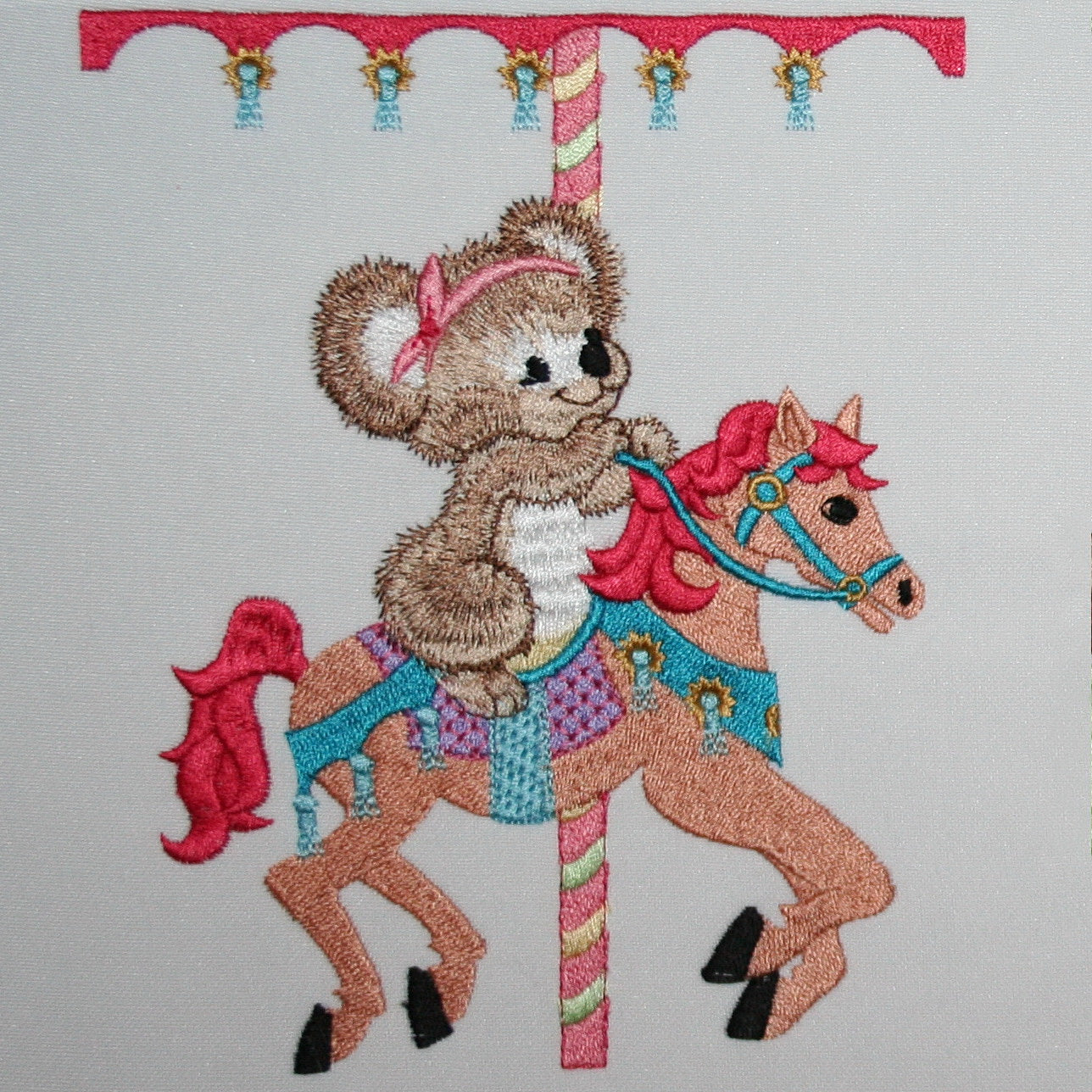 Bunny and the other Fuzzy friends are enjoying their ride on the carousel horse at the Fuzzyland Amusement park.You receive: 2 designsHoop size: 1 x 4*4 and 1 x 5*7 hoopStitch count: 19,438 - 29,609