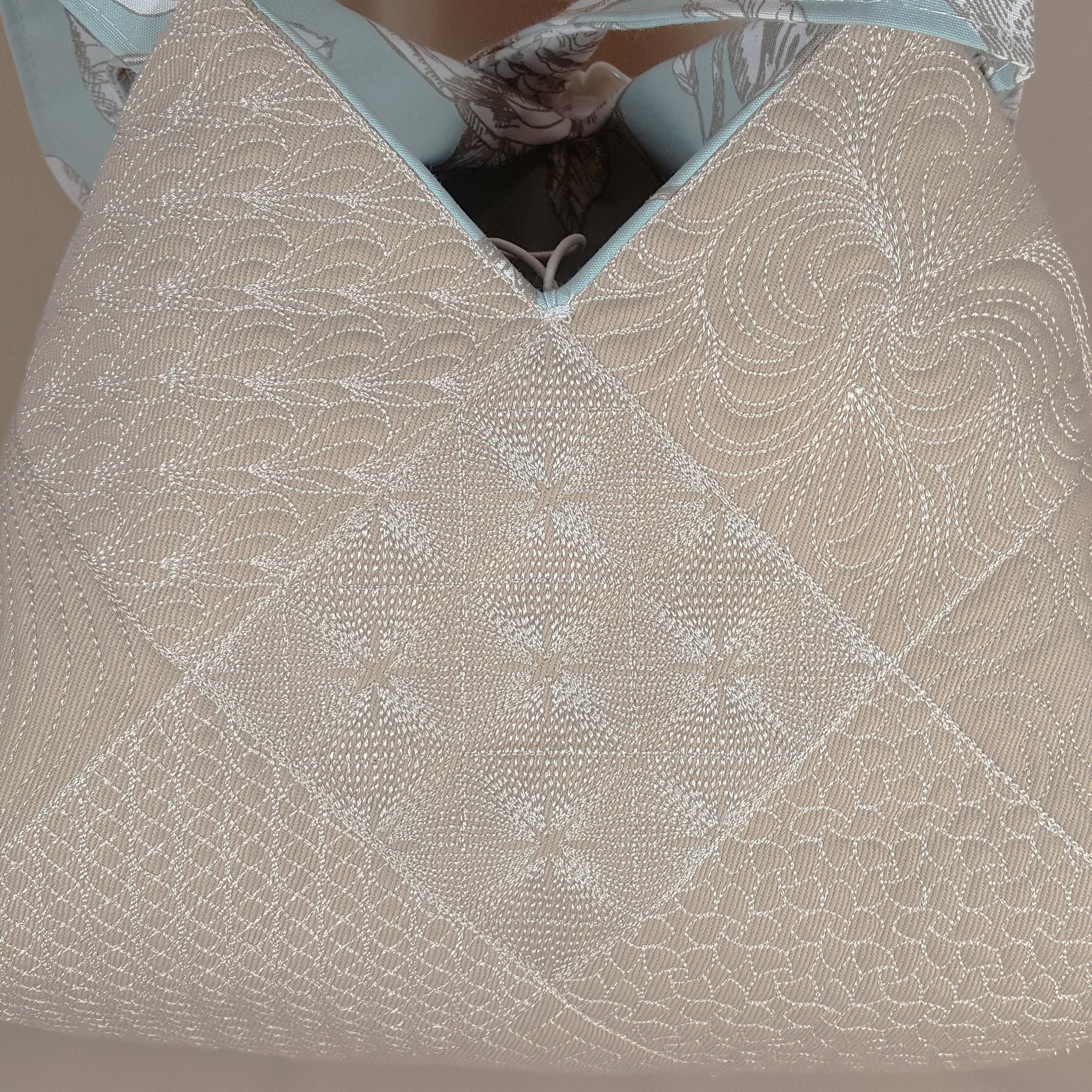The Tote Bag size will be approx 12" x 13" (4*4 hoop bag) or 14" x 15" (5*5 hoop bag). Use the large Blocks to complete a Beautiful Quilt.