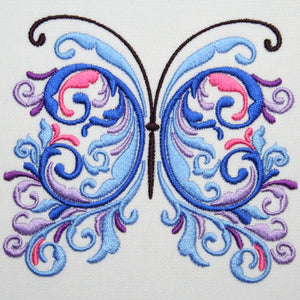 Wings of Versailles captures the opulent beauty of a French garden butterfly with intricate threadwork and delicate wing details, perfect for adorning linens, blouses, or creating stunning wall art—simply hoop your fabric, load the design, and let your machine bring this regal butterfly to life.