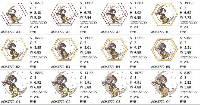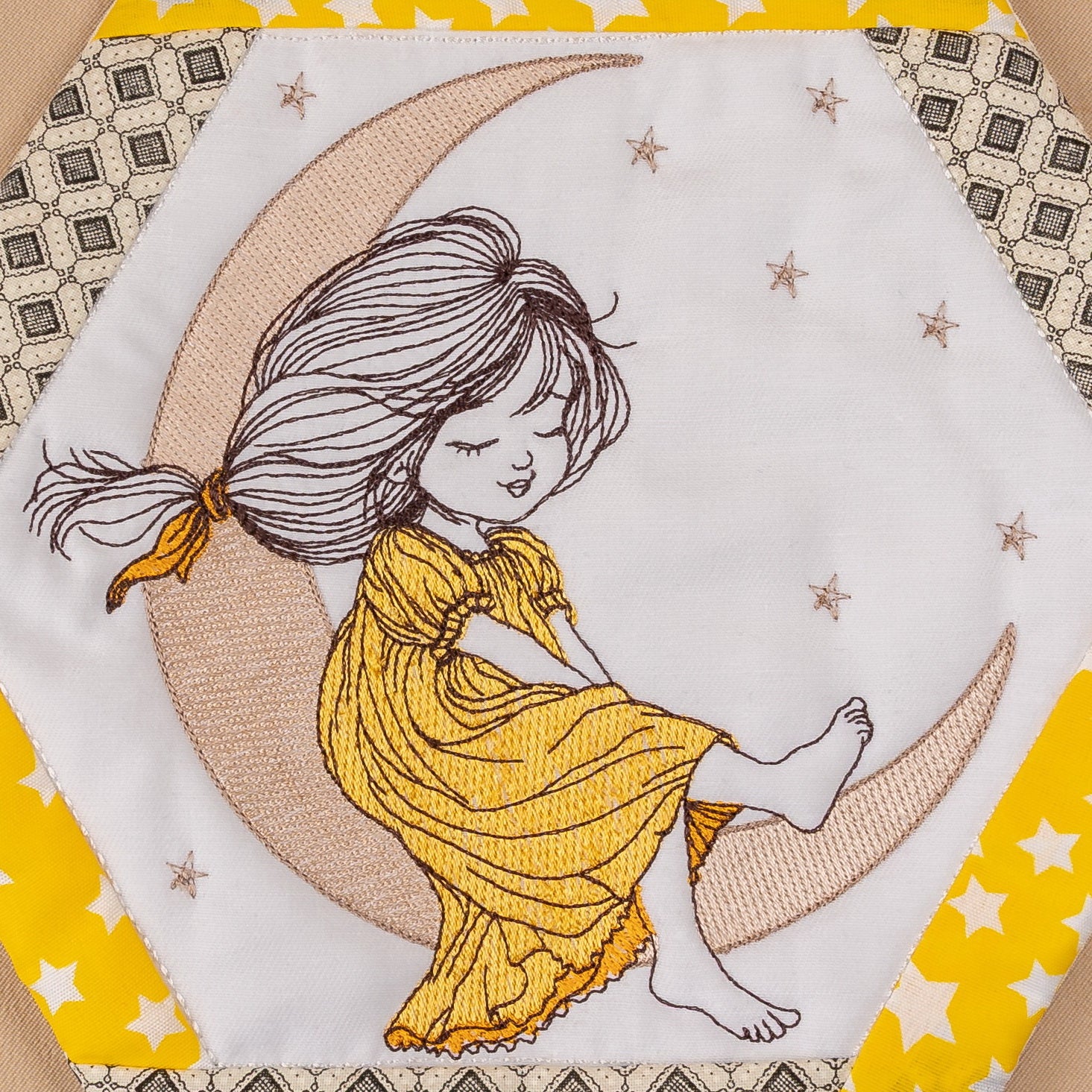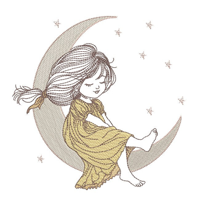 This charming design captures a peaceful moment: a young girl in a flowing dress, sitting contentedly on a crescent moon surrounded by delicate stars. The detailed stitching brings warmth and whimsy to life, making it perfect for creating a twisted hexagon mugrug that's both decorative and functional.