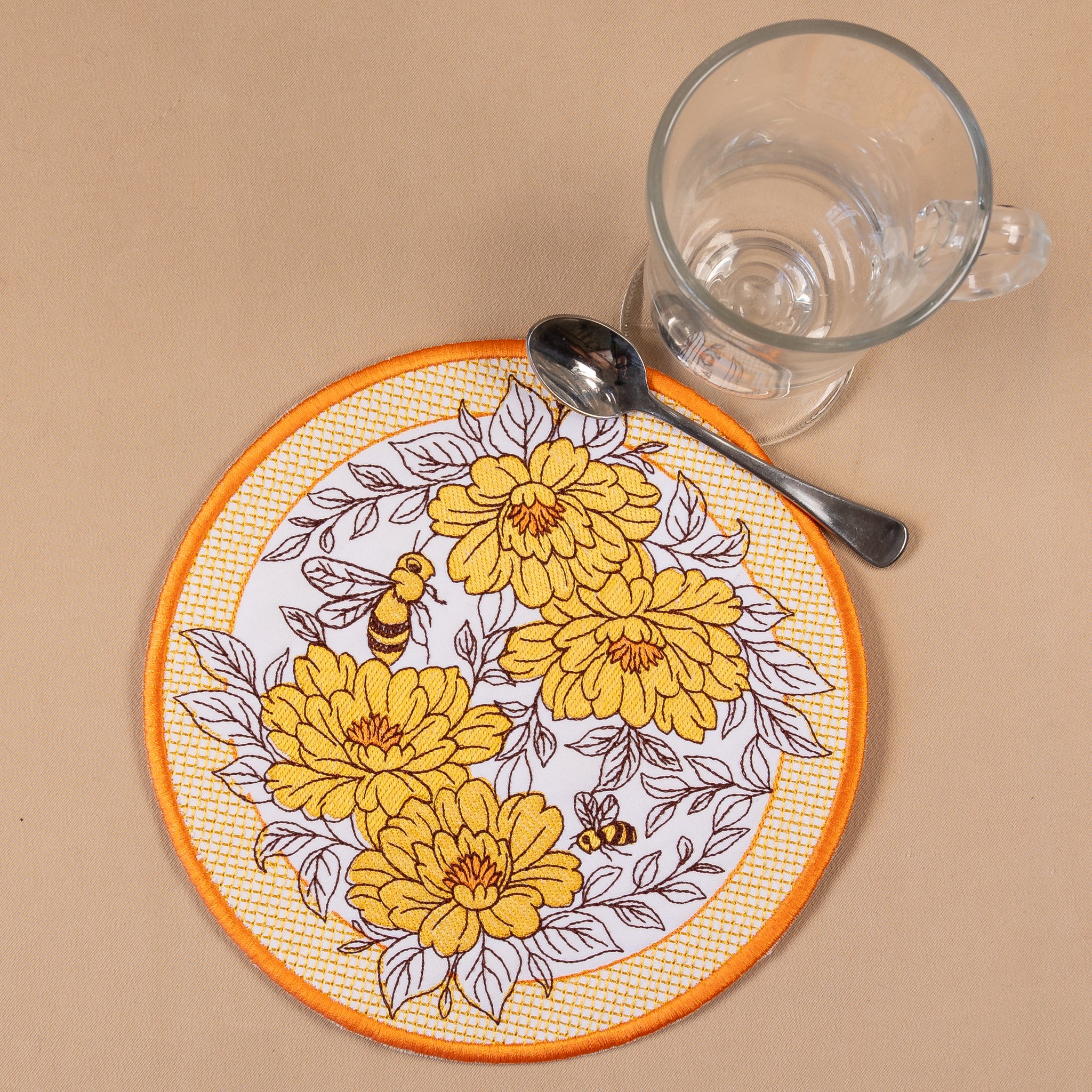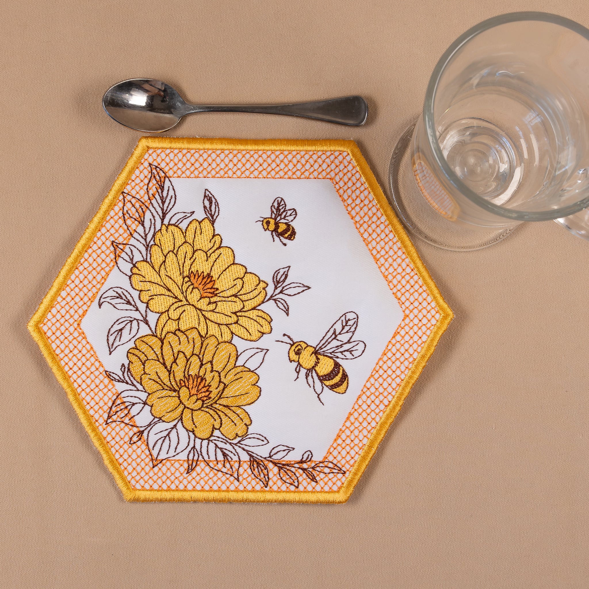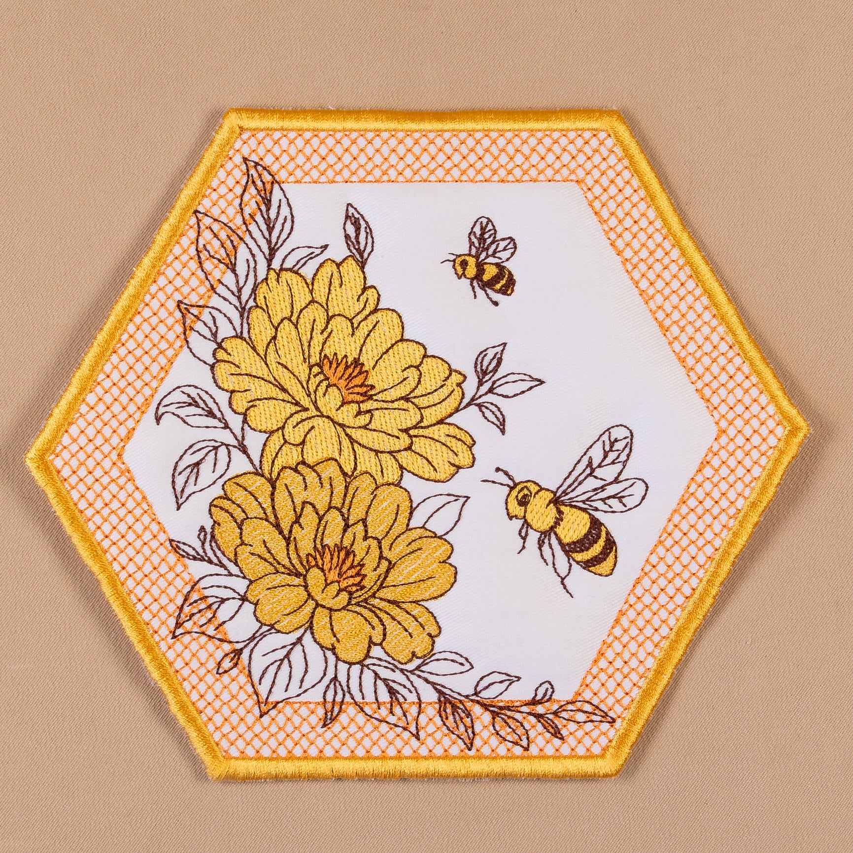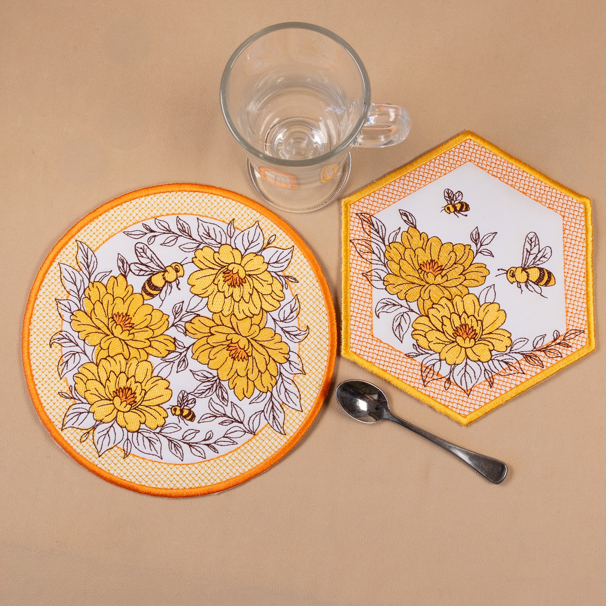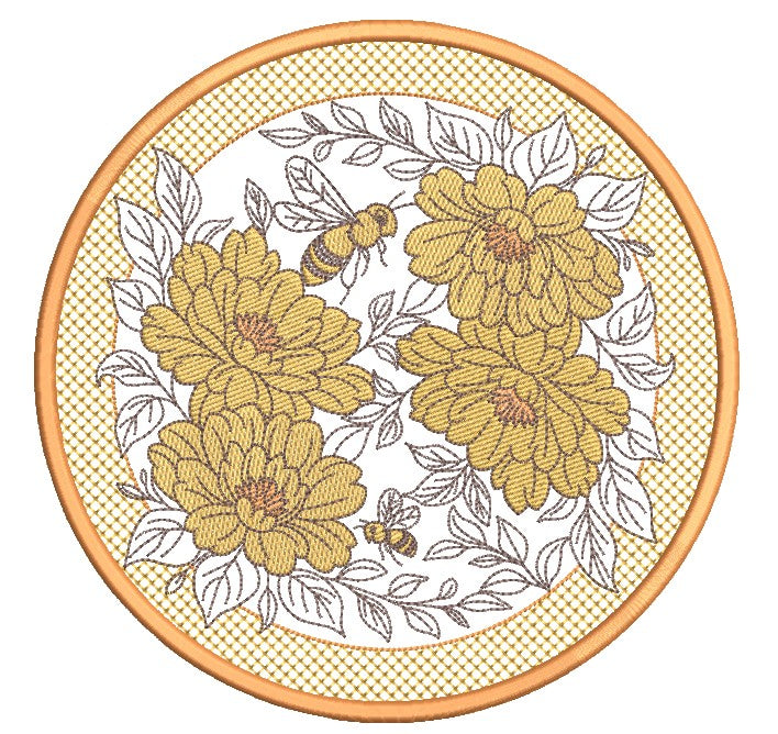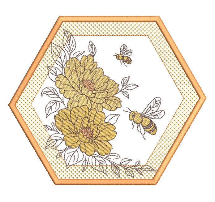 These cheerful embroidery designs burst with beautiful large blossoms, busy bees, and a charming lace-filled border adding texture. Stitch a few of the hexagon designs to create a coaster, mugrug or large placemats. It also shines on table runners, tote bags, pillow sleeves, wall hangings, aprons, and seasonal home décor projects.