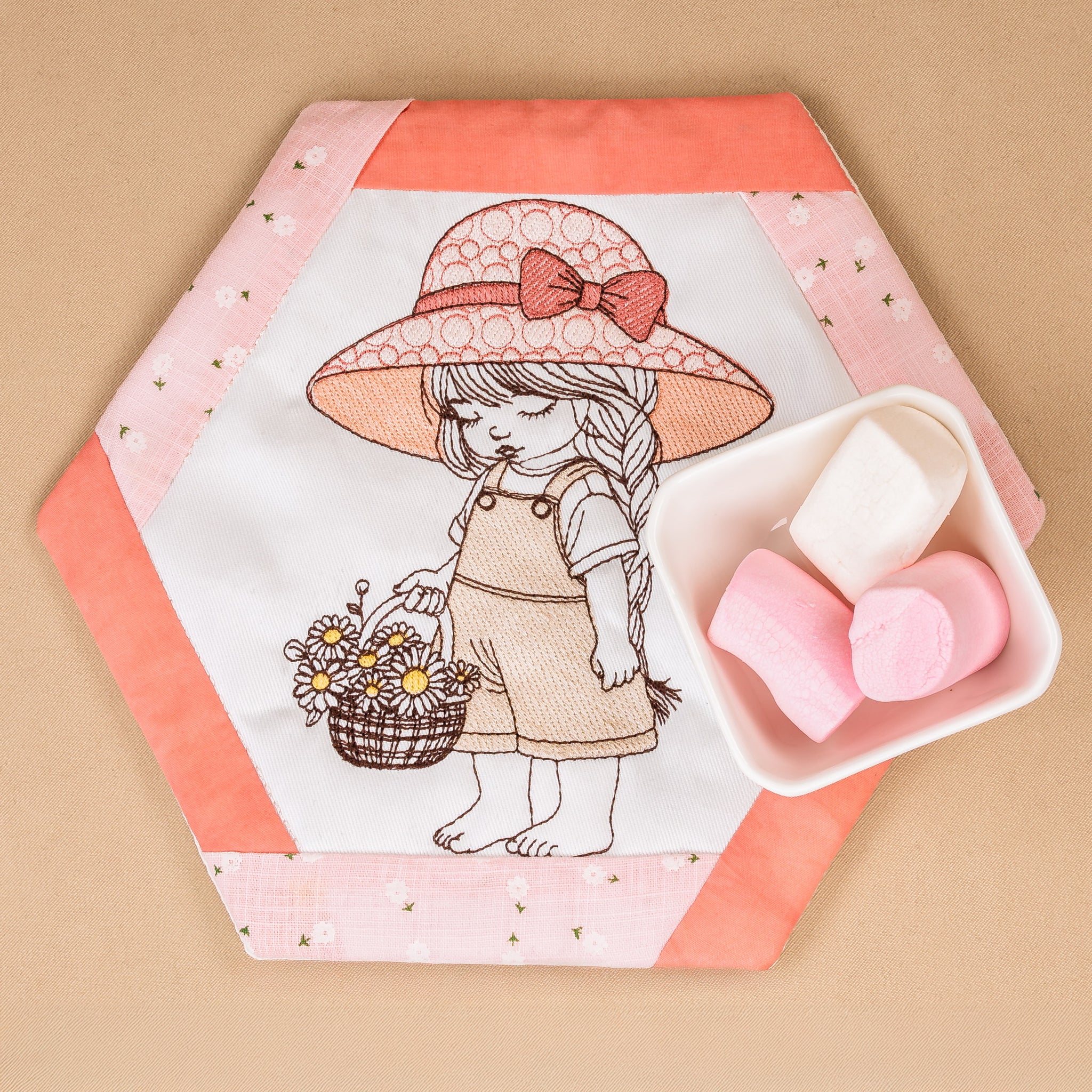 Stitch her onto a mugrug or small mat to bring a little sweetness to your morning ritual. She turns any coffee nook or breakfast tray into a tiny moment of joy.
