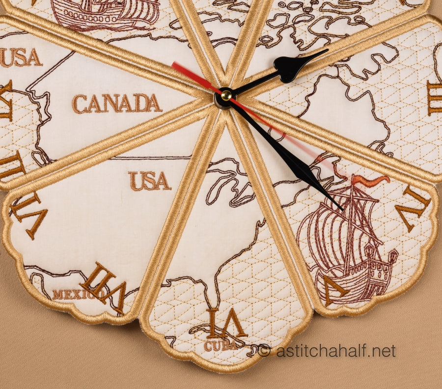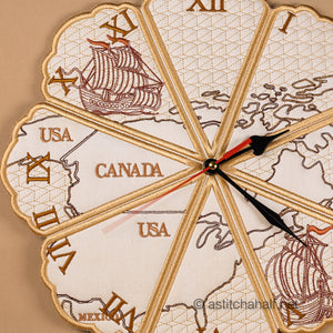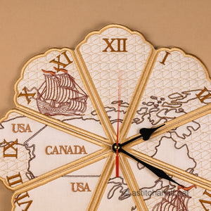 Create your own stunning 13" Continental Timekeeper North America with this detailed machine embroidery design that turns any fabric into a beautiful timepiece. This elegant clock design would make a lovely addition to your living room, kitchen, or office space, adding both style and charm to any wall.