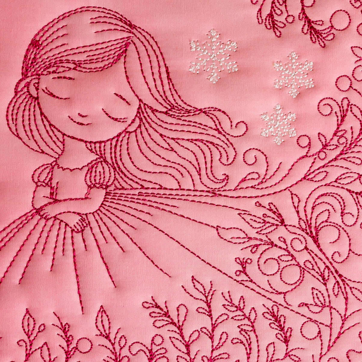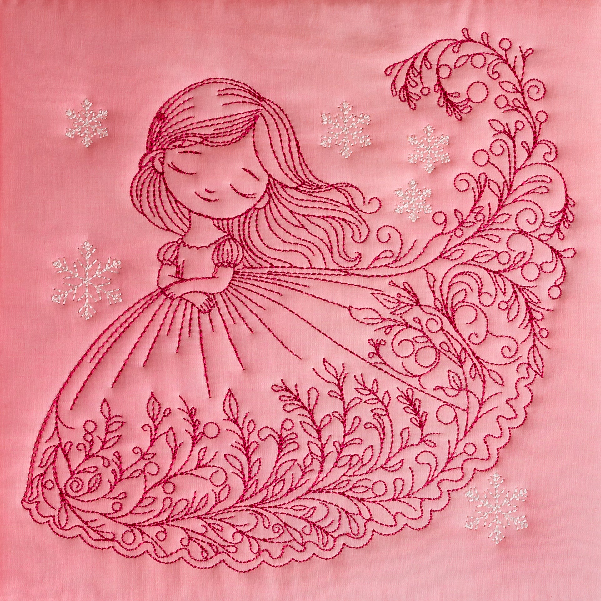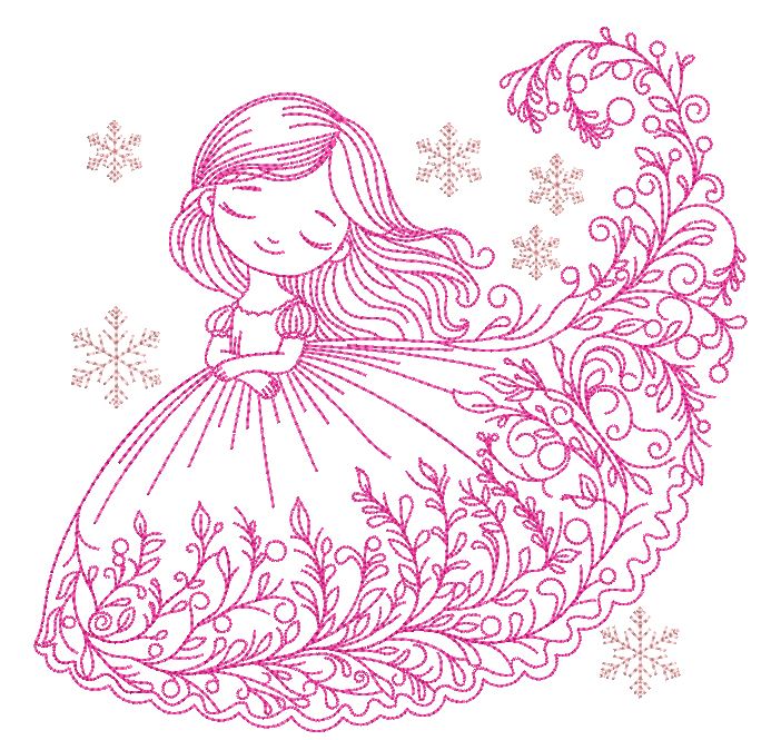 Meet our October Child—her dress a cascade of flowers and tiny leaves dancing in the breeze, with delicate snowflakes gently settling around her.